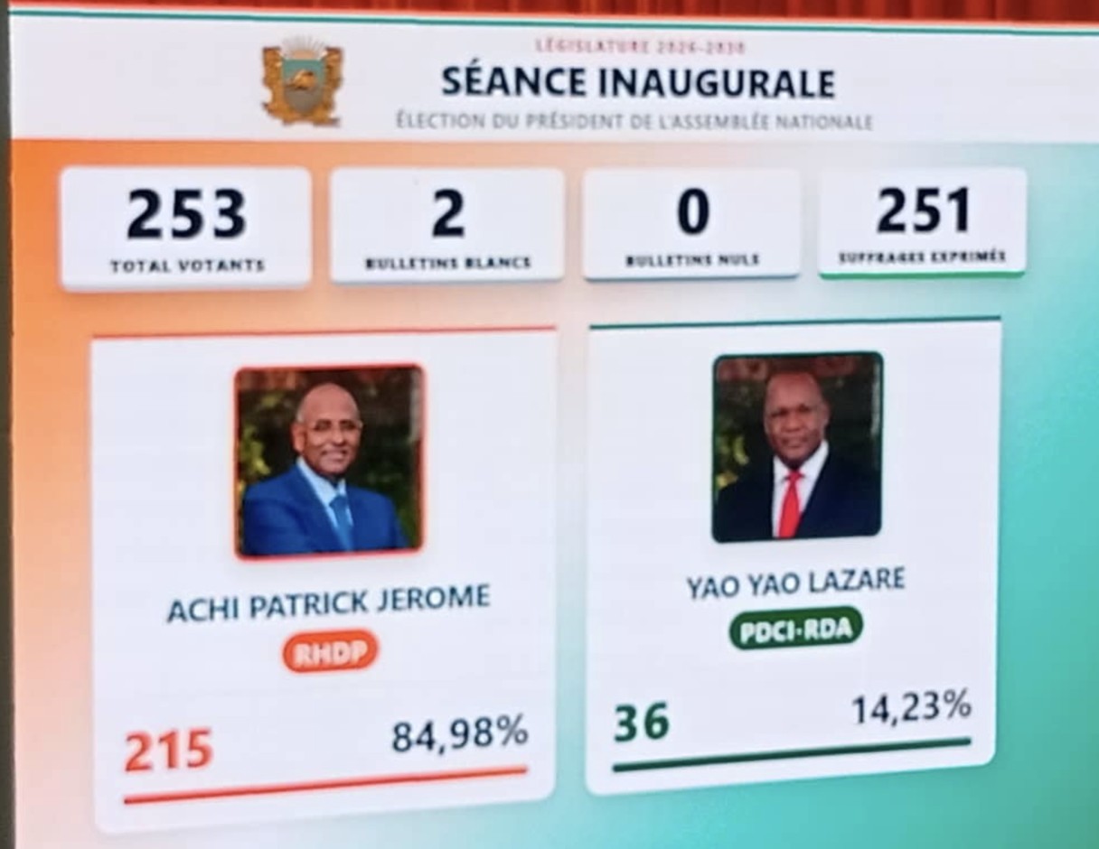 Jérôme Patrick Achi, candidat du Rassemblement des Houphouëtistes pour la Démocratie et la Paix (RHDP, parti au pouvoir), a été élu, samedi à Abidjan, nouveau président de l’Assemblée nationale ivoirienne, succédant à Adama Bictogo.