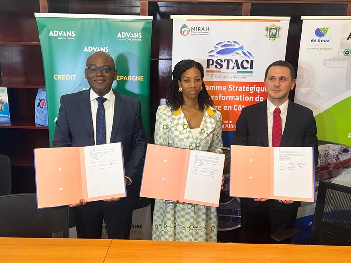 La cérémonie a été couplée par la signature de deux partenariats avec Advans Côte d’Ivoire, une institution financière, et De Heus Côte d’Ivoire (KOUDIJS), un fournisseur d’aliments aquacoles sans OGM, et la SGPME comme garant des crédits accordés aux producteurs.