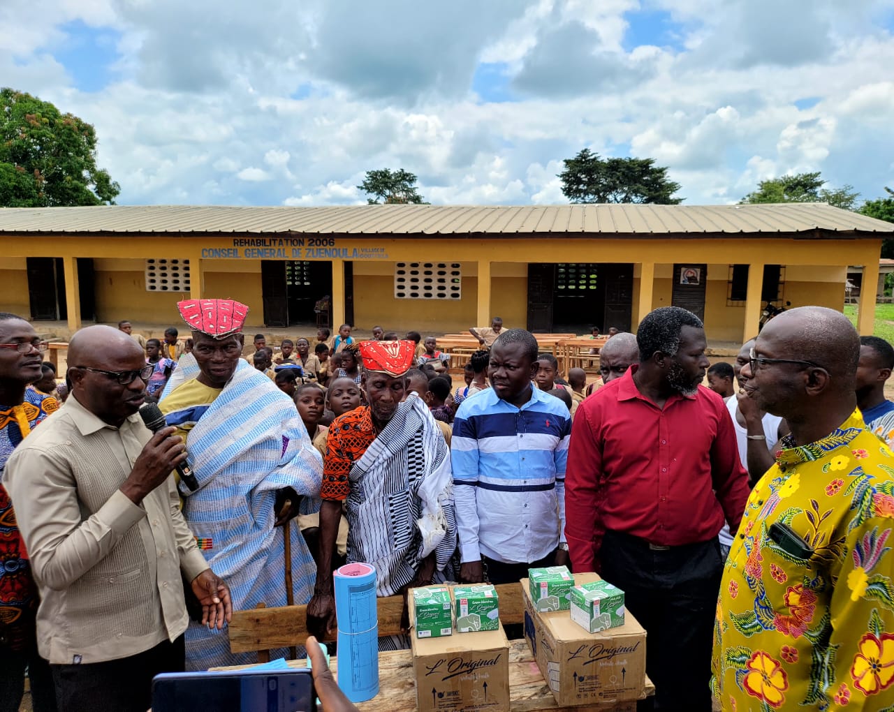 Dans son allocution, M. Foua Koeli Gaston, président de la MUDEGOG, a procédé à la remise symbolique du don à l’IEPP. Le lot offert comprenait 100 tables-bancs, 2 cartons de craies, 18 répartitions, 6 cahiers journaliers, ainsi que 6 tableaux récapitulatifs, en réponse à une doléance formulée par le directeur de l’école, confronté à l’insuffisance de matériel face à la croissance des effectifs.